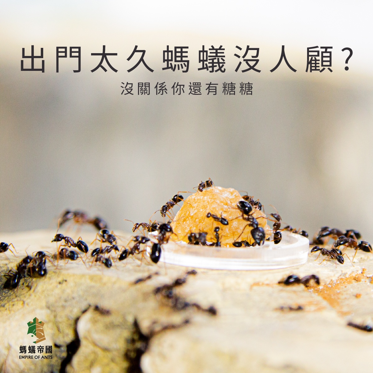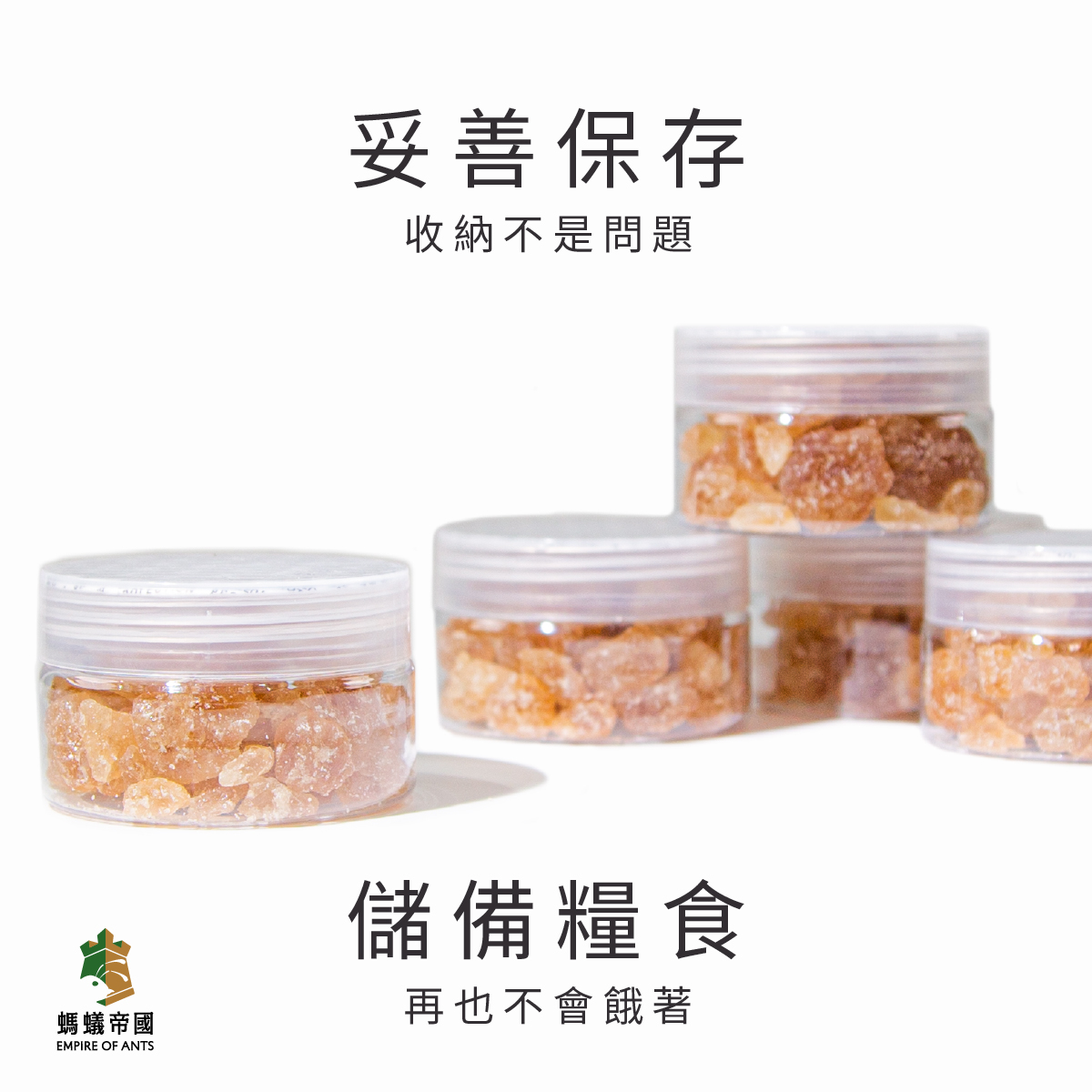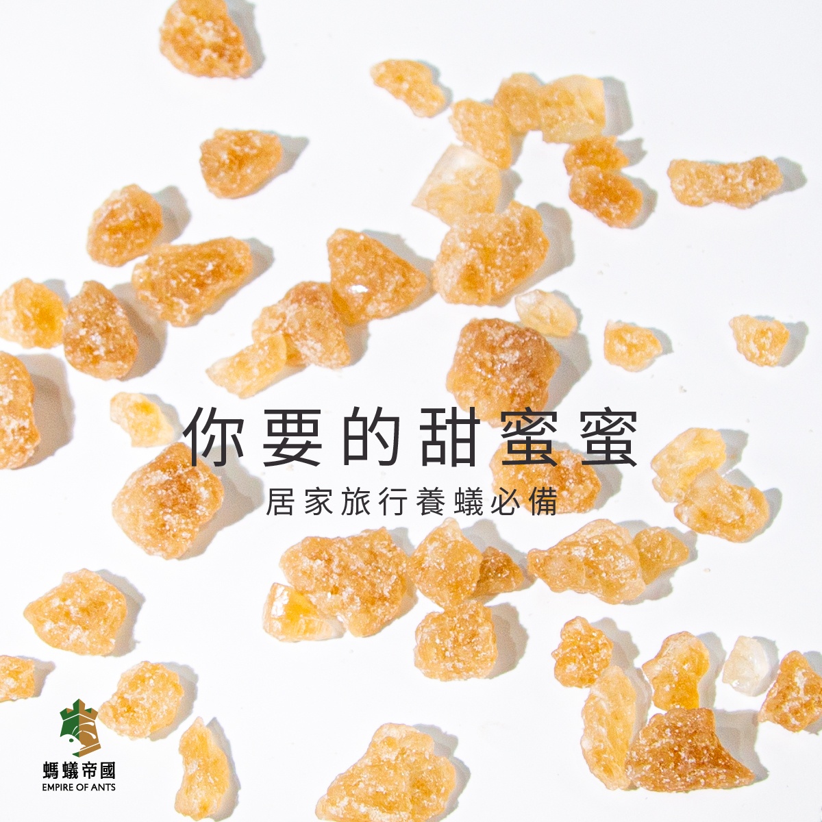 選用嗜口性與營養價值較高的黃晶冰糖,可提供工蟻所需的營養成分,若有外出可放置於食盆上提供螞蟻較長時間供應的食物來源,避免外出太多天螞蟻太過飢餓。